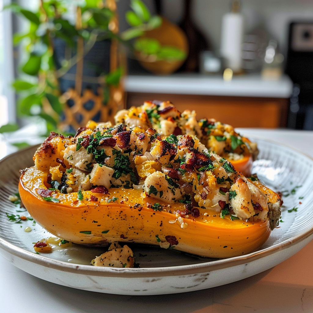 Honey Roasted Butternut Squash Stuffed with Chicken Delight