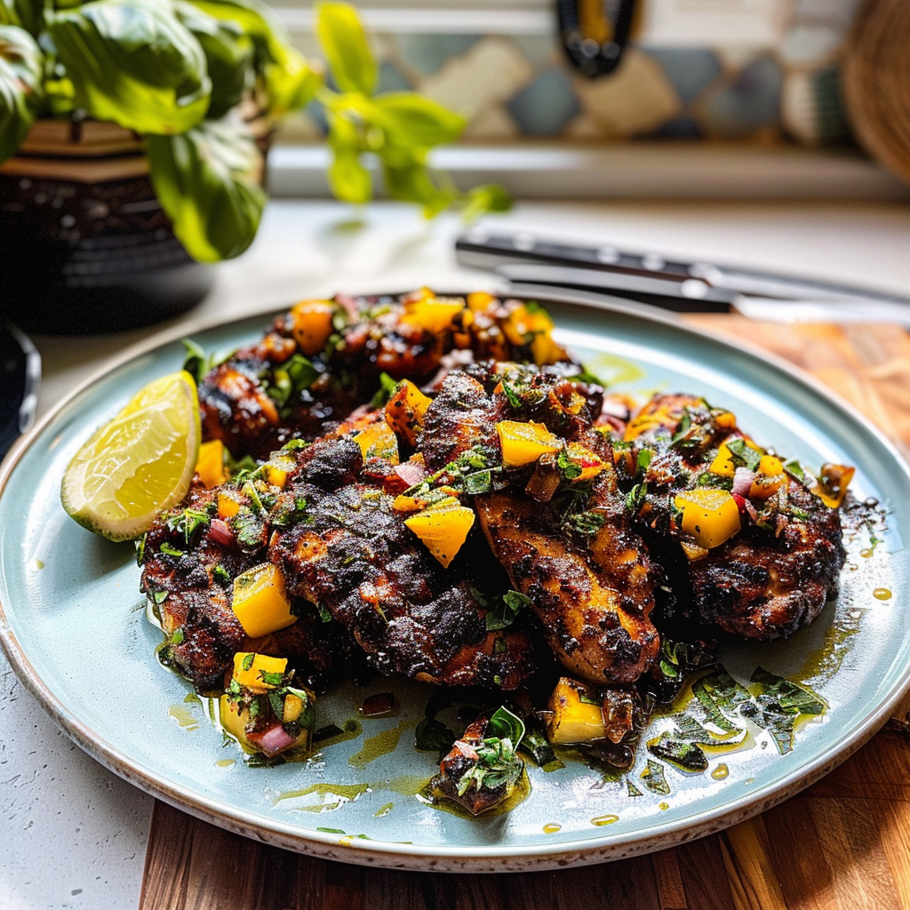 Tropical Jerk Grilled Chicken with Charred Mango Salsa Verde