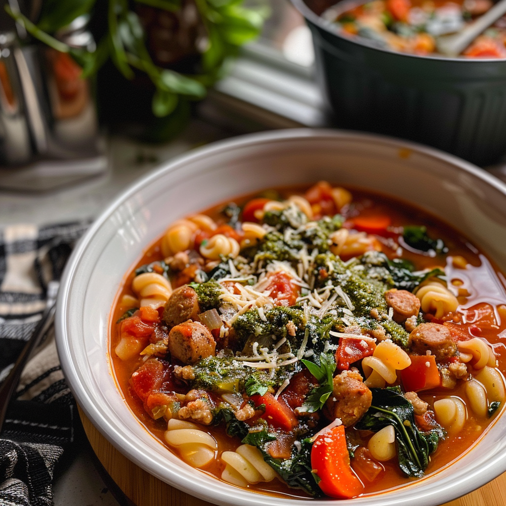 Enjoy making this delightful minestrone with sausage and pesto while creating mouthwatering memories along the way!