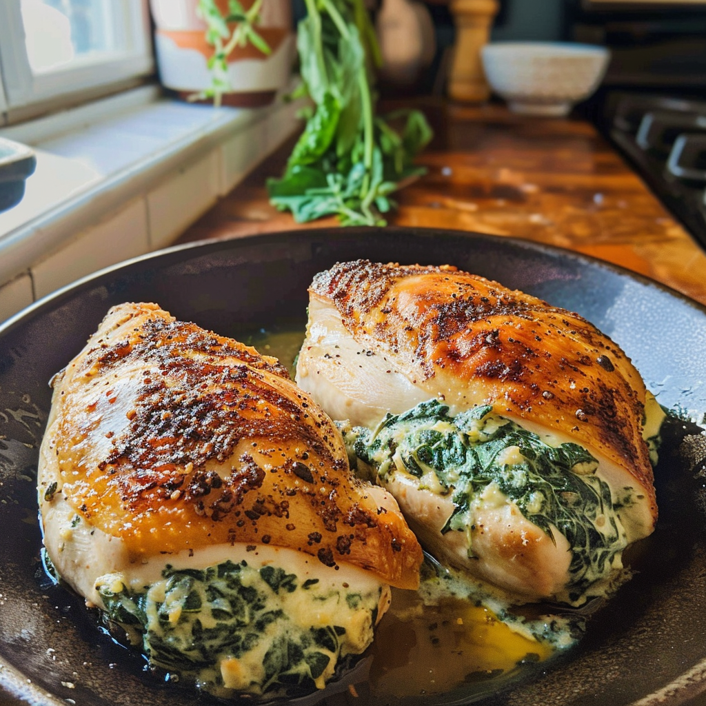 A tender chicken breast, stuffed to the brim with vibrant spinach, creamy cheese, and just the right amount of spices, is a feast for both the eyes and the taste buds. As you cut into this succulent dish, the flavors burst forth like a confetti cannon at a surprise party, bringing joy to every bite.